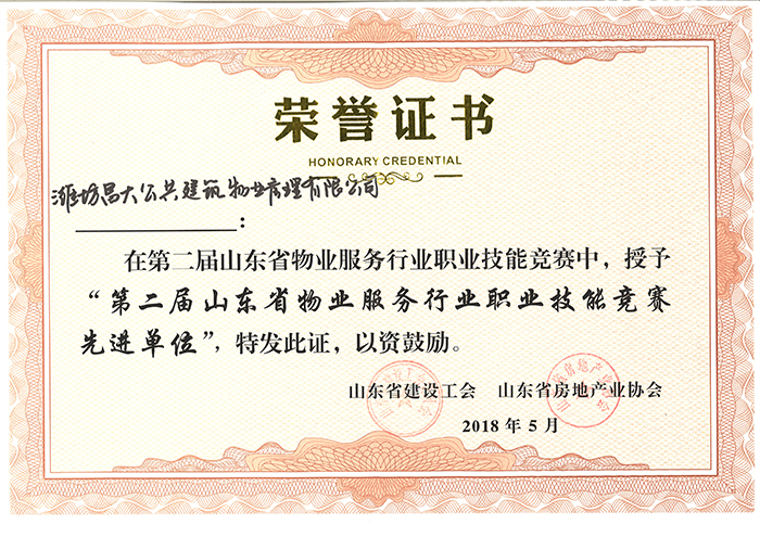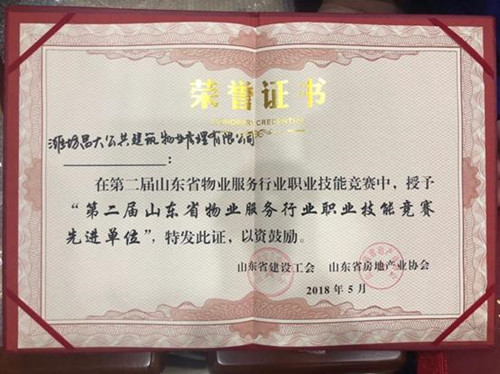 2018年5月被評為第二屆山東省物業(yè)服務行業(yè)職業(yè)技能競賽現進單位